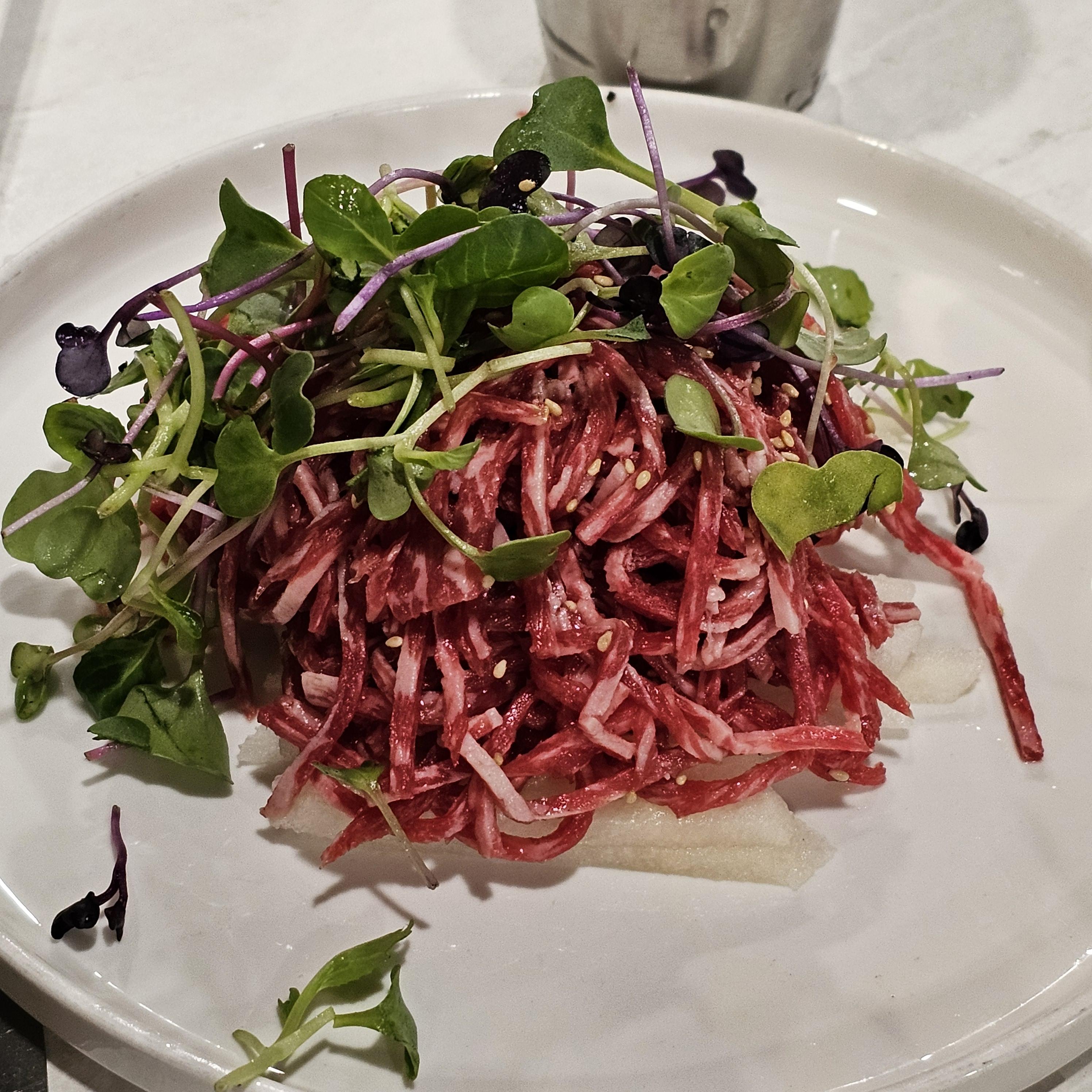 잊을 수 없는 맛이다. 육회에 마블링이 존재한다니 감탄을 금치못했다. 서늘하게 차갑고 시원하며 너무 맛있었다. 구미 오태동에 위치한 농우마실에서 육회를 시키고 맛보니 너무 맛있어서 육회는 추가로 하나 더 주문했다.