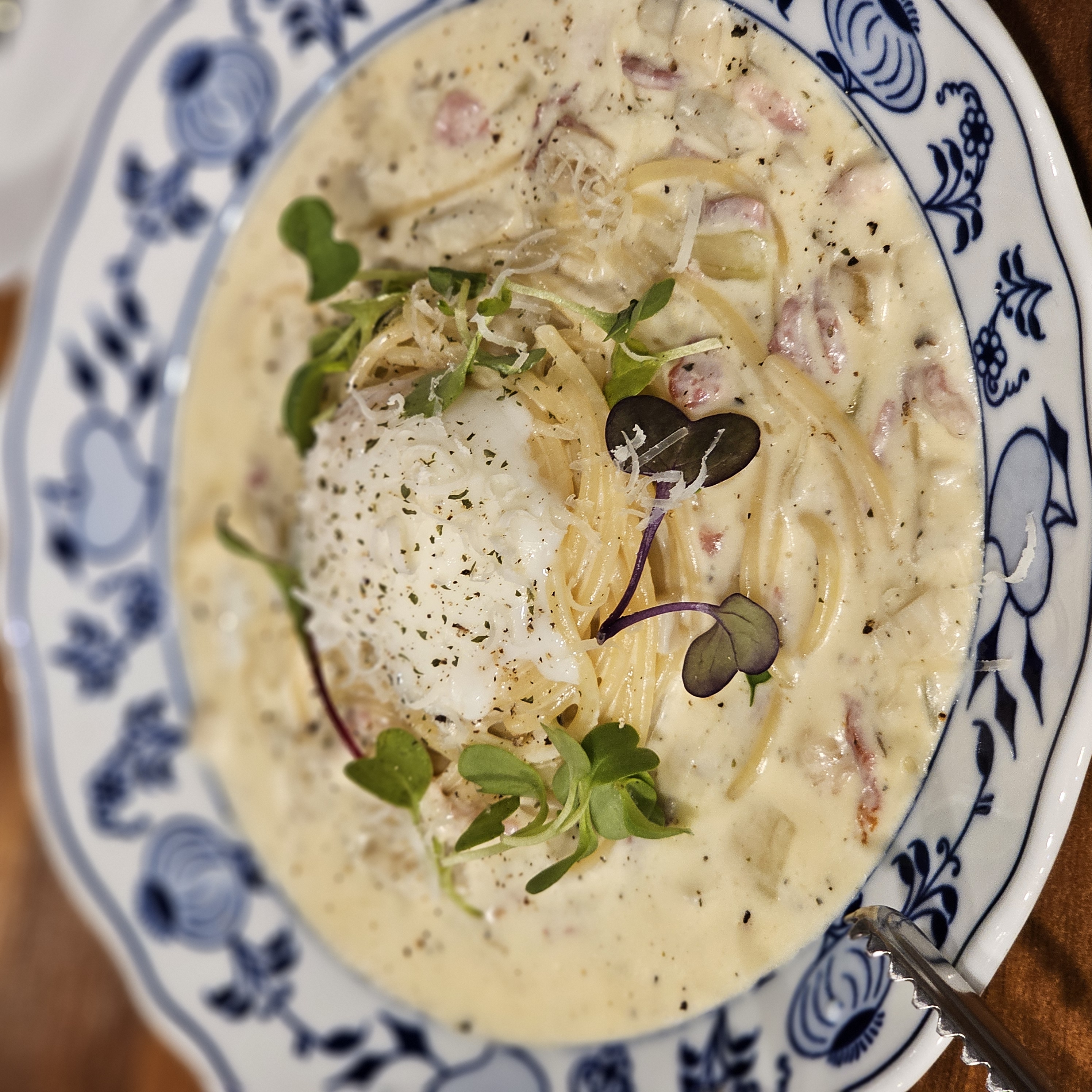 오랜만에 크림파스타인 까르보나라도 시켰어요. 계란 노른자를 넣어주셔서 잘 저어서 섞어주었네요.
