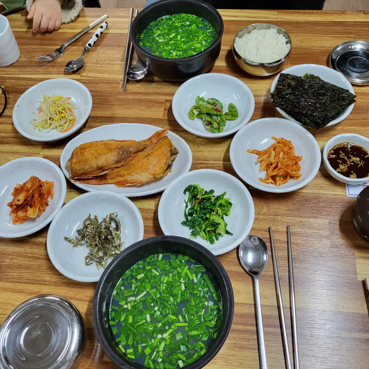 재첩국 2인분을 주문하였는데 아이 먹으라고 별도로 너무나도 감사하게도 아이용 재첩국도 추가로 주셨다. 아이용 숟가락과 포크도 구비되어 있었다. 기본 찬들도 정갈하며 맛있었다. 무채무침, 멸치볶음, 콩나물무침, 시금치무침, 열기구이, 김과 간장 등 다양하게 나왔고 재첩국 안에는 재첩과 부추가 수북이 담겨있었다. 기본 반찬으로 나온 열기구이가 고소하니 참 맛있었다. 기장 시장에서도 많이 판매하고 있어 구입할까 망설여졌다.